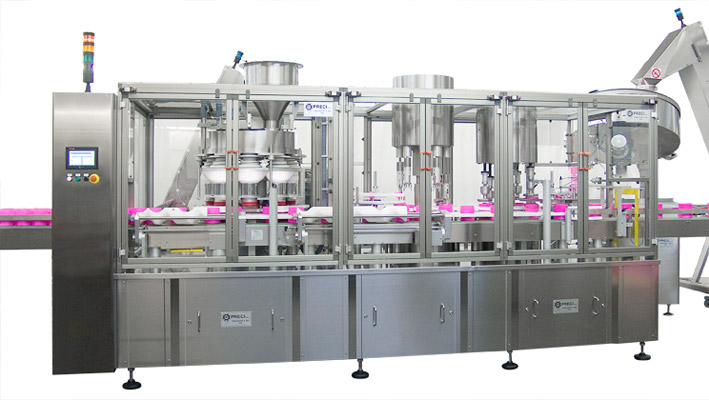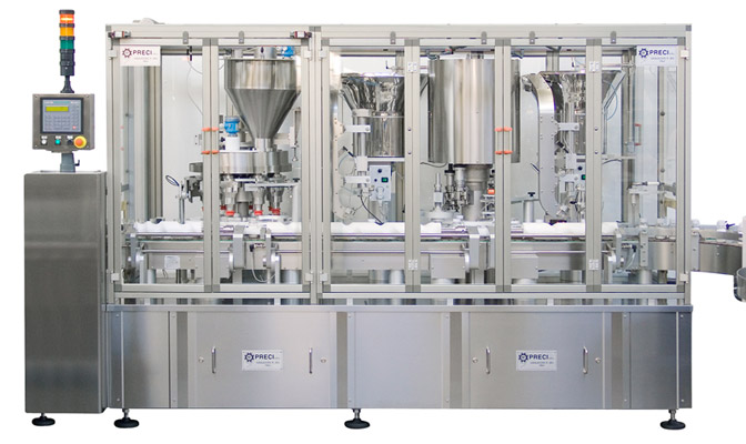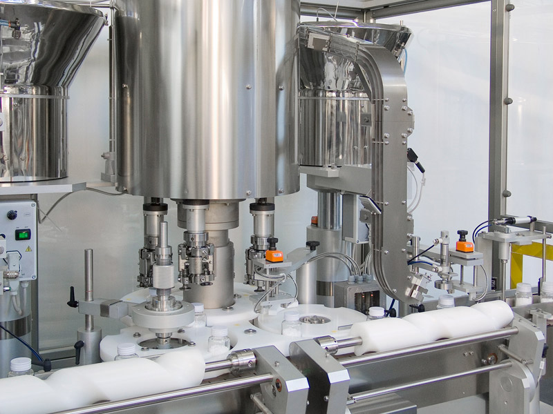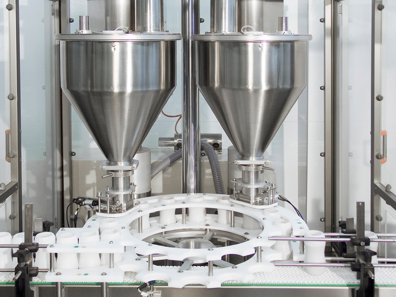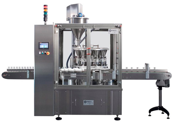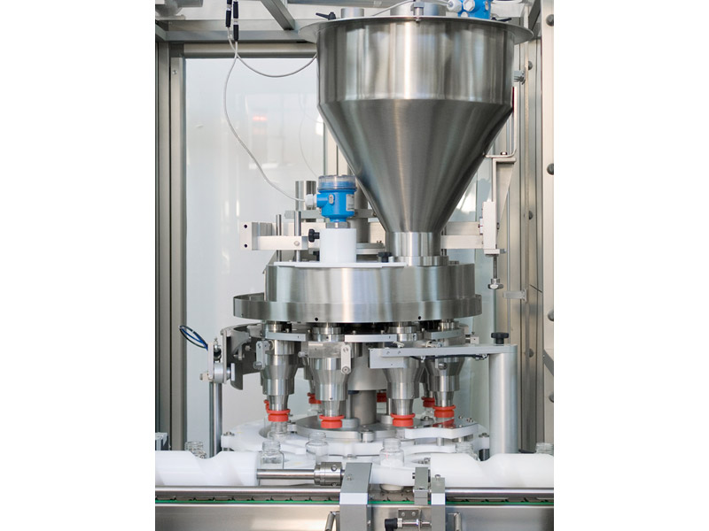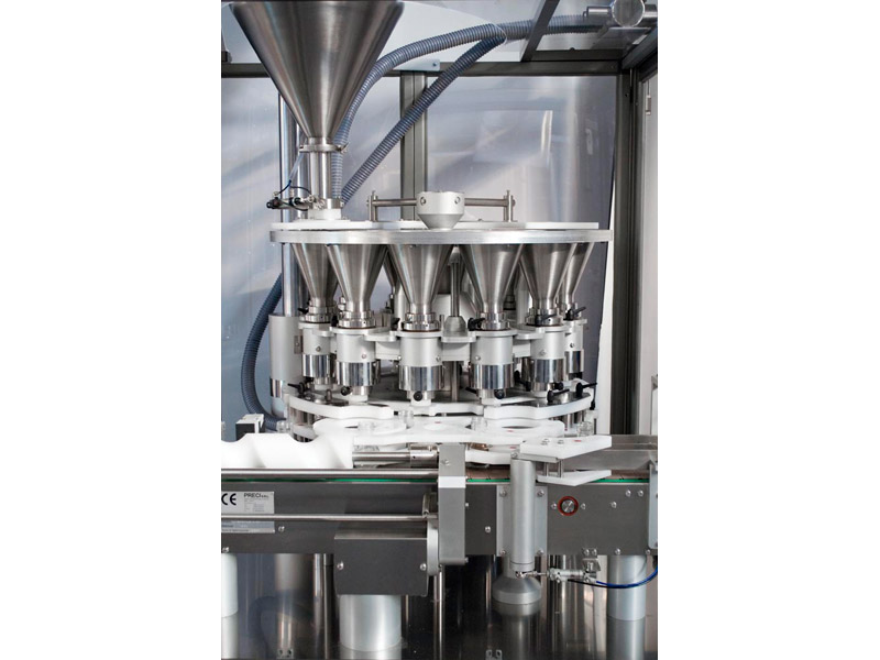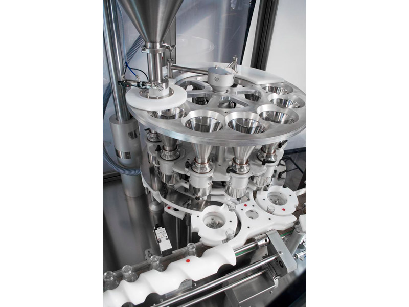 Il modello “E” è una macchina automatica a movimenti continui per dosare, invece, polveri farmaceutiche fini, impalpabili, scorrevoli in flaconi (sciroppi secchi, antibiotici, integratori, baby food).
